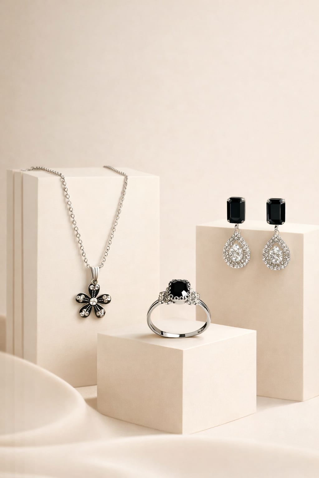 This sophisticated jewelry set showcases a timeless blend of bold contrast and refined sparkle. Featuring a striking black gemstone centerpiece, the set includes a sleek silver-tone ring adorned with delicate side stones, a pair of elegant drop earrings with shimmering crystal halos, and a matching pendant necklace with a floral-inspired design. The deep black stones beautifully contrast with the radiant silver finish, creating a look that is both modern and classic. Perfect for formal occasions or adding a touch of luxury to everyday wear, this coordinated set offers effortless elegance and versatility.